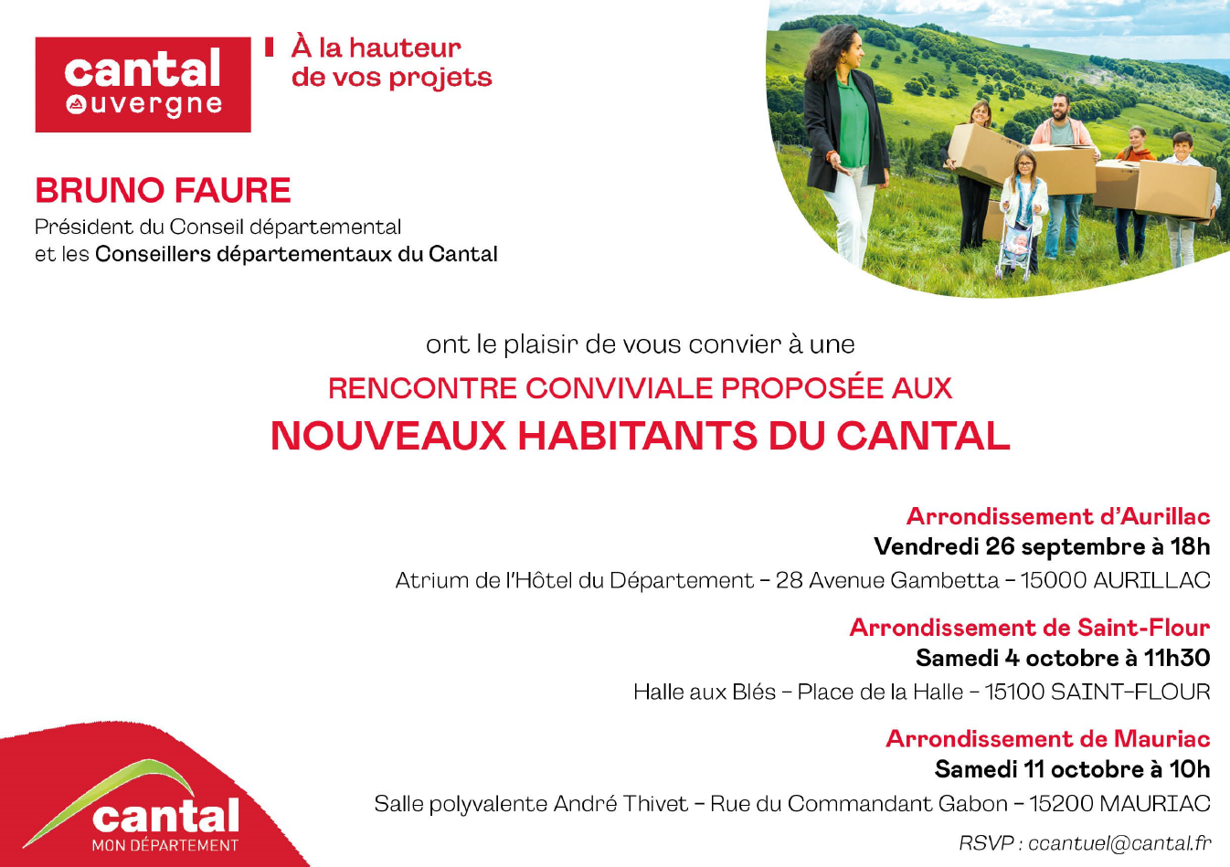BRUNO FAURE Président du Conseil départemental et les Conseillers départementaux du Cantal ont le plaisir de vous convier à une RENCONTRE CONVIVIALE PROPOSÉE AUX NOUVEAUX HABITANTS DU CANTAL.